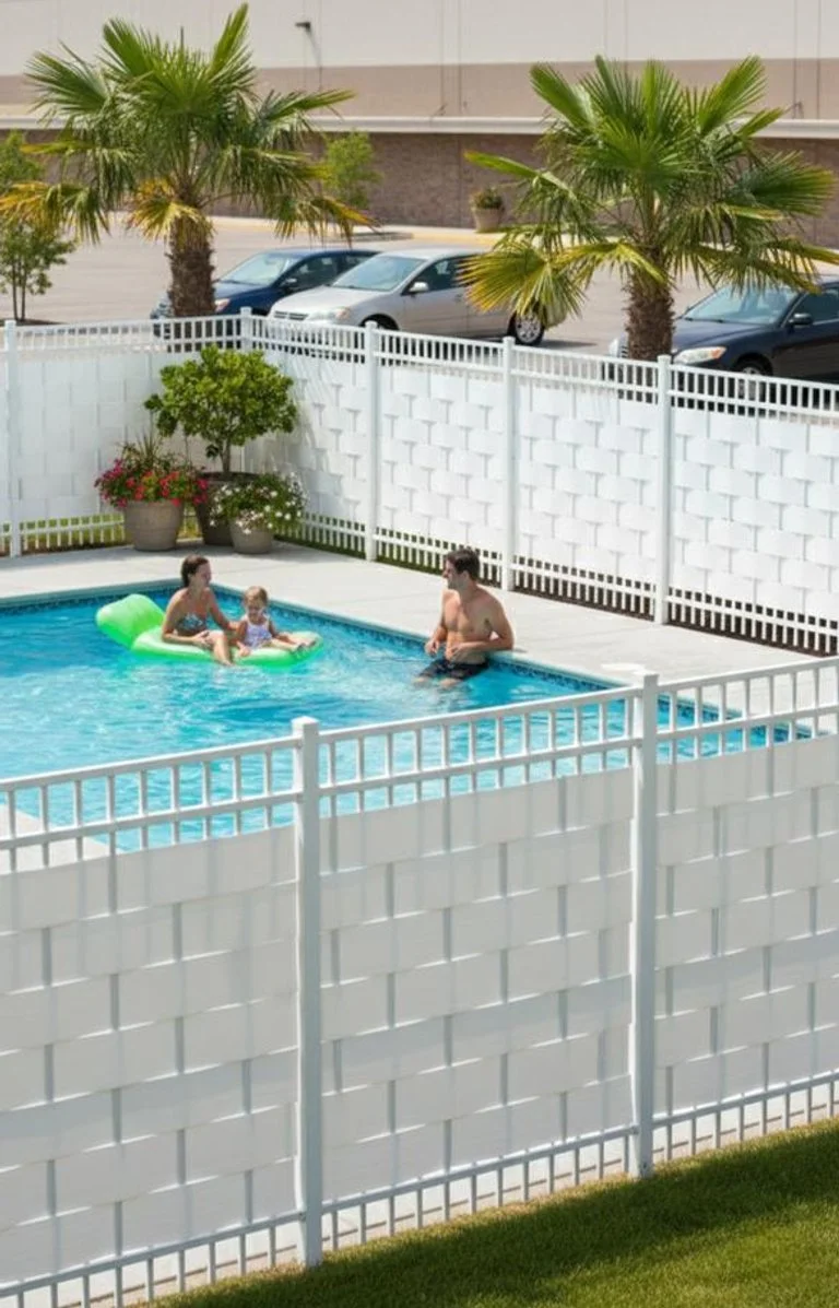 The privacy material is made from heavy-duty vinyl engineered for outdoor exposure.